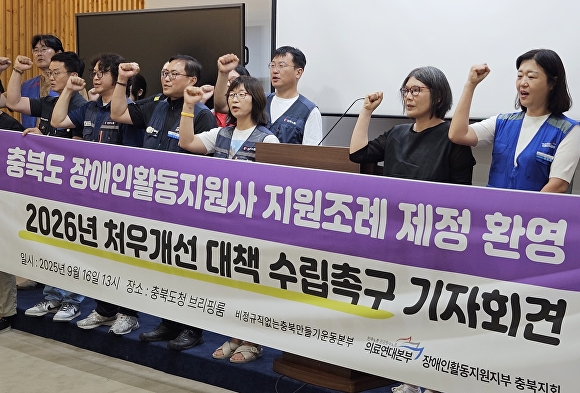 충북지역 장애인·노동단체가 충북도의회에서 ‘장애인활동지원 인력 처우개선 및 지위 향상에 관한 조례안’이 통과한 것과 관련해 환영의 뜻을 밝히면서도, 실효성 있는 예산 반영을 촉구했다. 이들은 16일 충북도청 브리핑룸에서 기자회견을 열고 “중증장애인 일상⋯