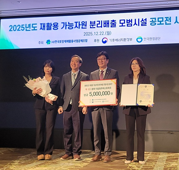 더샵 청주 퍼스트파크 ‘재활용 분리배출’ 대상 영예더샵 충북 청주 퍼스트파크(관리소장 조해순)가 재활용 가능자원 분리배출 모범시설 공모전에서 공동주택 부문 영예의 대상(환경부 장관상)을 차지했다. 시상식은 22일 서울 양재동 엘타워에서 열렸다. 한국포장재재활용사업공제조합이 주최하고, 기후에너지환경부와⋯