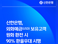 신한·국민 미화→원화 환전 이벤트…우리, 외화예금 금리 인하신한은행이 오는 26일부터 다음 달 25일까지 외화예금을 원화로 바꾸는 고객에게 90%의 환율 우대 혜택을 준다고 20일 밝혔다.신한은행은 미화를 원화로 환전한 금액으로 원화 정기예금에 가입할 때 0.1%포인트(p)의 우대금리도 선⋯