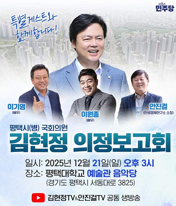 더불어민주당 김현정 국회의원, 평택서 의정보고회…국회 성과 직접 설명경기도 평택시(병) 김현정 국회의원(더불어민주당)이 오는 21일 오후 3시 평택대학교 예술관 음악당에서 의정보고회를 개최한다. 이번 의정보고회는 김 의원이 국회 의정활동 성과와 지역 현안 추진 상황을 시민들에게 직접 설명해 향후 입법·정책 방향을 공유⋯