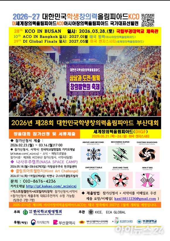 한국학교발명협회, 2026 대한민국학생창의력올림피아드 부산서 개막대한민국 최대 규모의 학생 창의력 경연대회인 ‘2026 제28회 대한민국학생창의력올림피아드(KCO)’가 내달 28일 부산 국립부경대학교 체육관에서 화려하게 막을 올린다. 이번 대회는 전국 초·중·고 학생들이 한자리에 모여 상상력, 문제해결력, 팀워크를 겨⋯