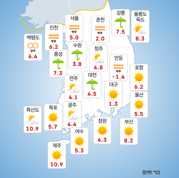 [날씨] 부울경 가끔 구름 많음29일 부산과 울산, 경남 지역은 가끔 구름이 많은 날씨를 보이겠다. 부산지방기상청에 따르면 이날 오전 9시 현재 주요 지역의 기온은 부산 8.2도, 울산 5.5도, 창원 4.3도로 기록됐다. 낮 최고기온은 부산 14도, 울산 13도, 경남 11∼⋯