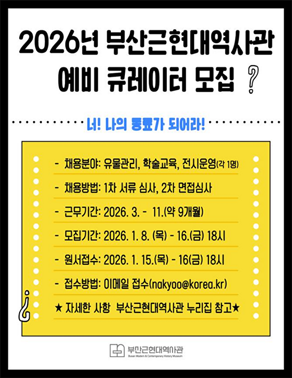 부산근현대역사관, 청년 ‘예비 큐레이터’ 3명 공개 모집부산근현대역사관이 박물관 학예 분야 전문인력 양성과 청년 일자리 창출을 위해 8일부터 오는 16일까지 ‘2026년 부산근현대역사관 예비 큐레이터(기간제근로자)’를 공개 모집한다. 모집 분야는 △유물관리 △학술교육 △전시운영 등 3개 분야로, 분야별 1명⋯