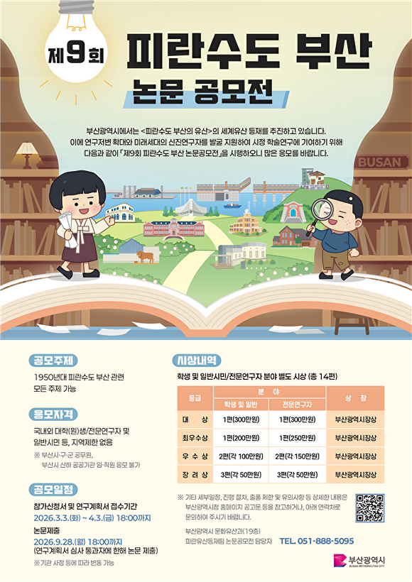 부산시, ‘제9회 피란수도 부산 논문 공모전’ 개최부산광역시가 13일 ‘제9회 피란수도 부산 논문 공모전’을 개최한다. 이번 공모전은 부산시의 ‘한국전쟁기 피란수도 부산의 유산’세계유산 등재 추진과 관련한 인지도 제고와 관련 연구의 저변 확대, 미래세대 신진 연구자 발굴 및 전문가를 양성하기 위해 마련⋯
