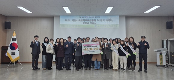 [포토] 제천시학부모연합회, 바자회 수익금 장학금 기탁충북 제천시학교학부모연합회(회장 서록희)는 27일 제천교육지원청(교육장 강성권)에 장학금 6030만원을 기탁했다. 이 장학금은 연합회가 지난 9월 26일 제천더그랜드컨벤션센터에서 연 난치병 어린이 돕기 사랑의 바자회의 수익금이다. 서록희 제천시학교학부모연합회⋯