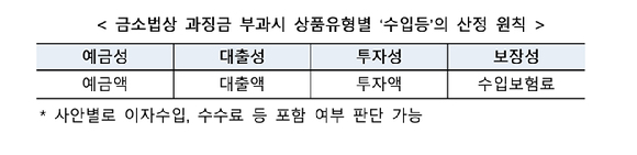19일 금융위에 따르면 예금성 상품은 예금액을 기준으로 한다. 대출성 상품은 대출액을 기준으로 적용한다. 투자성 상품은 투자액을 사용한다. 보장성 상품은 수입보험료를 기준으로 처리한다. 이자 수입과 수수료는 사안에 따라 포함할 수 있다.