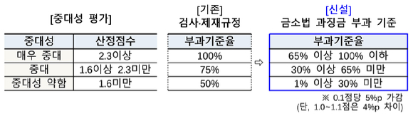 금융위는 부과 기준율 체계도 중대성 평가점수에 따라 1~100% 범위에서 기준율을 산정하도록 했다. 매우 중대한 사안은 65~100% 구간을 적용한다. 중대한 사안은 30~65% 구간으로 평가한다. 중대성이 약한 사안은 1~30% 범위에서 산정한다. 기준율은 0.1점당 5%포인트(p)씩 조정한다. 기존 기준은 50~100%의 단순 3단계였다.