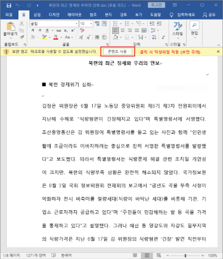 이어 자신이 작성한 북한 정세 관련 칼럼에 대해 조언을 구하면서 타깃에게 악성 문서 파일을 이메일로 전달했다. 첨부된 문서에는 악성 매크로 명령이 삽입돼 있어 메일 수신자가 '콘텐츠 사용'을 허용할 경우 해킹 위협에 노출된다.