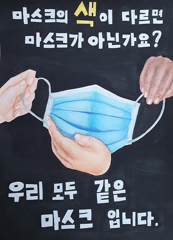 대상은 정무창(고창중 3)군의 ‘우리 모두 같은 마스크입니다’가 받았다. 현재의 신종 코로나바이러스 감염증(코로나19)상황을 반영한 마스크를 주제로 마스크의 색은 다르지만 우리는 모두 같은 사람이라는 의미를 담아 심사위원의 높은 점수를 얻었다.