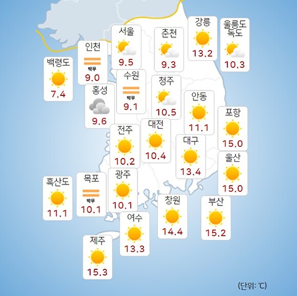 이날 오전 9시 현재 기온은 부산 15.2도, 울산 15.0도, 경남(창원) 14.4도로 기록됐다.