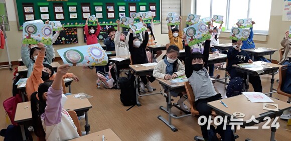 전라남도 백운초등학교 체험 활동에 참여한 학생들이 교실에서 작품을 들어 올리고 좋아하고 있다. [사진=윤준호 기자]