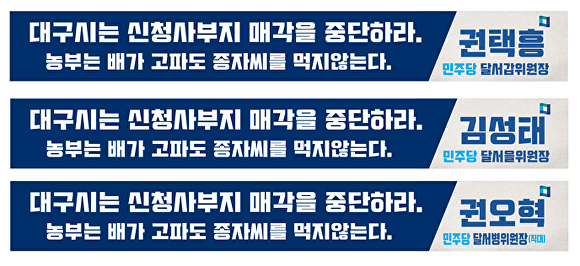 [아이뉴스24 이창재 기자] 더불어민주당 대구시당 달서구 지역 위원장들이 14일 대구광역시의 신청사 건립을 위한 부지 일부 매각과 관련해 홍준표 대구시장의 독단적 행정을 비판하는 현수막을 내걸었다.