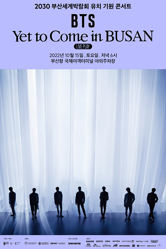[아이뉴스24 박성현 기자] 부산항만공사(BPA)가 오는 15일 부산항국제여객터미널 야외주차장에서 '2030 부산세계박람회' 유치를 기원하는 그룹 방탄소년단(BTS) 콘서트 'Yet To Come in BUSAN' 라이브 플레이를 진행한다고 14일 밝혔다.