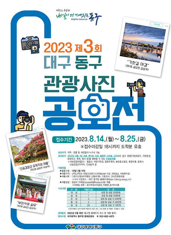 2020년, 2022년에 이어 올해 3번째로 개최되는 이번 사진 공모전은 대구 동구의 자연경관, 역사와 문화, 축제, 명소 등 동구의 모든 관광자원을 소재로 하며, 지역·연령에 제한 없이 누구나 참여 가능하다.