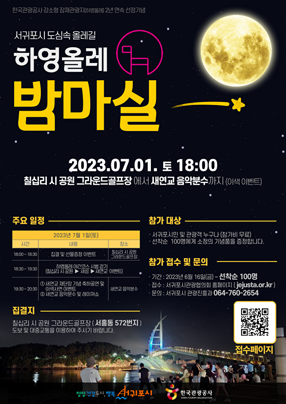 [아이뉴스24 박태진 기자] 제주특별자치도 서귀포시가 내달 1일(토) 저녁 새롭게 재단장한 하영올레 1코스에서 새연교를 중심으로 하영올레 야간코스 시범걷기와 이색 이벤트 ‘하영올레 밤마실’을 개최한다.