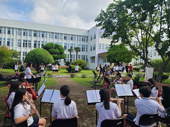 [아이뉴스24 박태진 기자] 제주 서귀중앙여자중학교는 지난 22일 명상숲에서 3학년 오소정외 12명으로 구성된 드림오케스트라가 학생들의 등굣길을 환영하는 ‘귀호강 프로젝트 Morning Concert’를 열었다고 밝혔다.