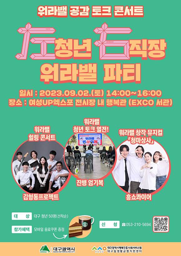 이번 토크콘서트는 지역 청년을 대상으로 청년 직장 성장기를 코믹하게 그린 '홍쇼콰이어'의 창작 뮤지컬과 청년 음악밴드 '김형동프로젝트'의 청년음악과 함께 청년이 생각하는 워라밸 문화와 워라밸 청년도시 대구를 만들기 위한 토론의 장이 펼쳐질 예정이다.