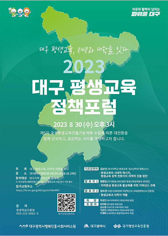 정책 접근성을 높일 수 있는 주제를 선정한 만큼 지역의 평생교육 현장 관계자와 언론인이 참여해 지정토론을 준비할 예정이며, 토론에는 대구과학대학교 평생교육원 우성진 원장을 좌장으로, 최미화 대구일보 편집국장과 김소영 수성구청 교육지원과 과장, 이은진 계명문화대학교 평생교육원 원장, 이계희 수성대학교 평생직업교육처 처장 등이 나선다.
