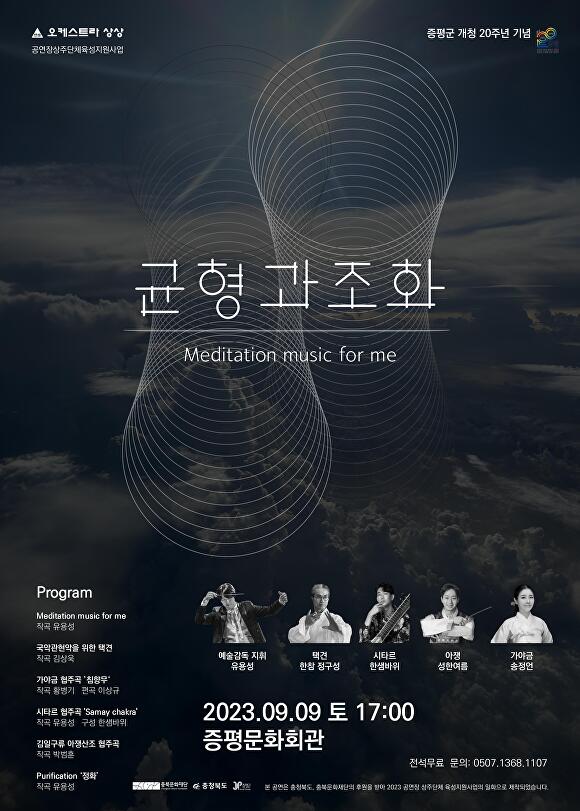 Meditation music for me ‘균형과 조화’는 오케스트라 상상이 2015년부터 공연해 온 우수레퍼토리 작품으로 이번 음악회에서는 증평의 자연과 쉼을 주제로 연주한다.