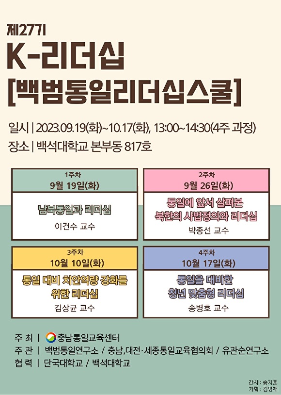 27기 백범통일리더십 스쿨은 오는 19일부터 천안 백석대학교에서 매주 화요일, 4주간 진행된다.
