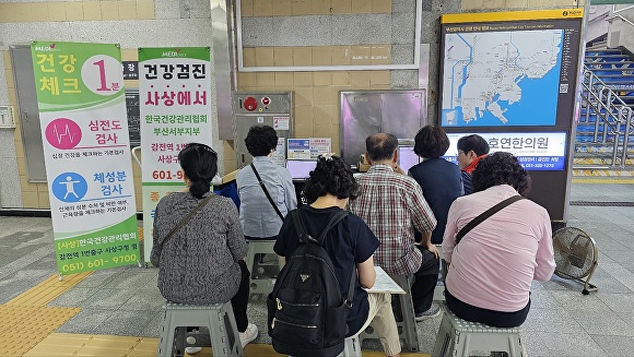 지하철 1호선 하단역에 마련된 한국건강관리협회 부산서부검진센터 건강체험터 부스에서 시민들이 1분 건강체크에 참여하고 있다. [사진=한국건강관리협회 부산서부검진센터]