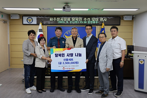 [아이뉴스24 이윤택 기자] 경기도 파주경찰서는 오늘(21일) 다가오는 추석을 맞아 파주참사랑회와 탈북민 대표 2명을 초청해 명절 선물세트 100개를 전달하는 추석맞이 행사를 개최했다.