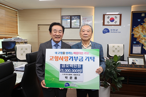 [아이뉴스24 한준성 기자] 박운용 ㈜이지디앤비 회장이 21일 충북 진천군에 지역 발전과 주민 복리증진을 위해 사용해 달라며 고향사랑 기부금 최고액인 500만원을 전달했다. 박 회장은 “고향사랑기부제를 통해 진천군 발전에 힘을 보탤 수 있어 매우 기쁘다”며 “모두가 행복한 으뜸도시 진천의 발전을 함께 응원하겠다”고 말했다.