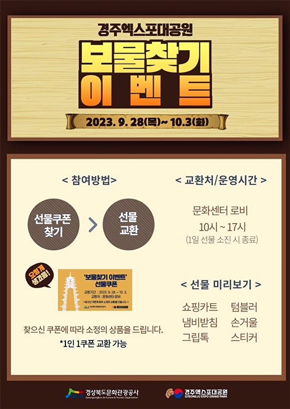[아이뉴스24 이진우 기자] 경상북도문화관광공사(사장 김성조, 이하 공사) 경주엑스포대공원은 추석연휴 기간인 28일부터 10월 3일까지 공원 관람객들을 대상으로 '한가위 보물찾기' 이벤트를 진행한다.