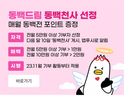 이번 행사는 동백드림에서 한 달간 5만원 이상을 기부하면 ‘동백천사’ 호칭을 부여하고 최대 2만원의 정책지원금을 지급한다.
