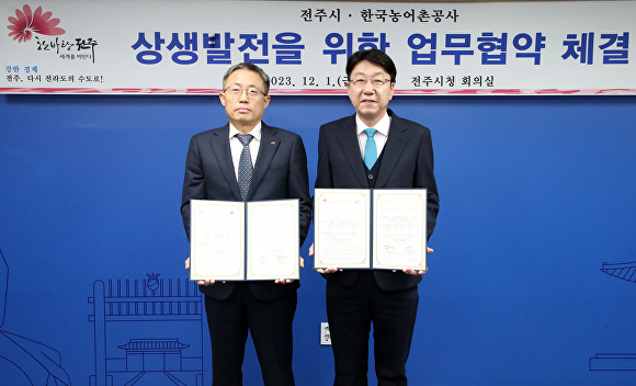 전주시와 한국농어촌공사 전북지역본부(본부장 이정문)는 1일 전주시장실에서 우범기 전주시장과 이정문 본부장 등 양 기관 관계자들이 참석한 가운데 ‘농업기반시설의 안전성 개선과 아중호수 등 저수지 관광사업 추진을 위한 상생발전 업무협약’을 체결했다.