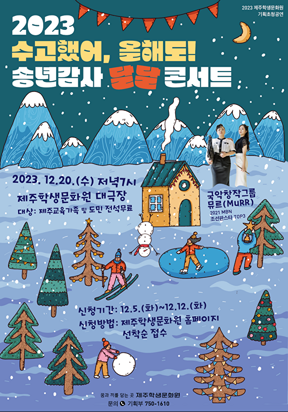 [아이뉴스24 박태진 기자] 제주학생문화원(원장 안희숙)은 제주교육가족초대 기획공연 ‘2023 수고했어, 올해도! 송년감사 달달 콘서트’ 공연을 오는 20일 저녁 7시 제주학생문화원 대극장에서 개최한다.