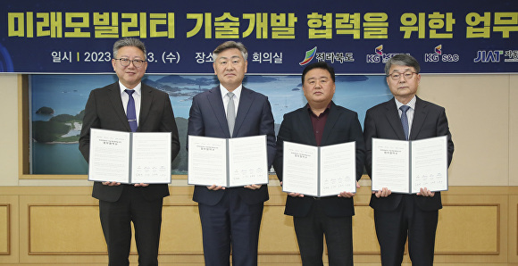 전북도가 13일 도청 회의실에서 김관영 전북도지사를 비롯해 김종현 KGM커머셜 대표이사, 조영욱 KG S&C 대표이사, 이항구 자동차융합기술원장 등이 참석한 가운데 전라북도–KGM커머셜–KG S&C–자동차융합기술원 간의 미래모빌리티 기술개발 협력을 위한 업무협약을 체결했다고 밝혔다.
