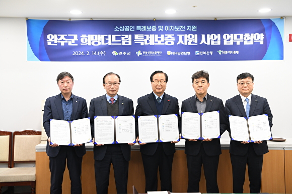 완주군은 유희태 완주군수, 전북신용보증재단 한종관 이사장, NH농협은행 김대호 전주완주시군지부장, 전북은행 서두원 부행장, 하나은행 우승구 광주전북영업본부장이 참석한 가운데 지난 14일 특례보증 사업 협약식을 가졌다.
