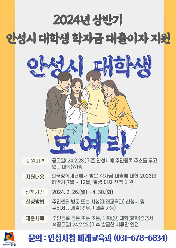 [아이뉴스24 이윤 기자] 경기도 안성시는 오는 오늘부터 4월 30일까지 ‘2024년도 상반기 안성시 대학생 학자금 대출이자’ 지원 신청을 받는다.