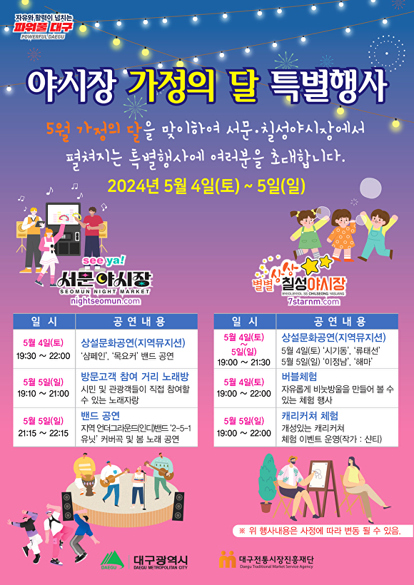 [아이뉴스24 이창재 기자] 대구시와 대구전통시장진흥재단은 ‘5월 가정의 달’을 맞아 4일과 5일 이틀동안 서문·칠성 야시장에서 거리노래방, 버블 체험, 캐리커처 등 즐길 거리와 버스킹 및 밴드 공연 등 볼거리를 제공한다.
