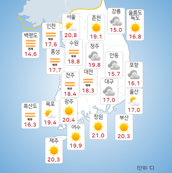부산지방기상청에 따르면 이날 오전 9시 현재 주요 지역의 기온은 부산 20.3도, 울산 17도, 창원 21도로 기록됐다.