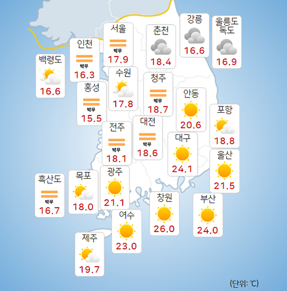 부산지방기상청에 따르면 이날 오전 9시 현재 주요 지역의 기온은 부산 24도, 울산 21.5도, 창원 26도로 기록됐다.