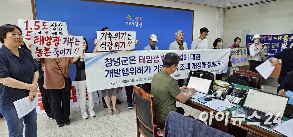이들은 이날 오후 창녕군청 브리핑룸에서 기자회견을 열고 "창녕군이 태양광발전 시설 이격거리를 입지 기준 완화 후, 허가 신청이 증가해 농지 잠식 및 자연 경관 훼손이 우려된다"며 "기존도로와 주거밀집 지역 250m에서 500m로 강화하려 한다"고 주장했다.