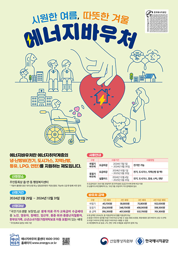 에너지바우처는 내달부터 2025년 5월 25일까지 사용가능하며, 하절기(7~9월)에 전기요금으로, 동절기(10월 ~ 25년 5월)에는 전기, 등유, LPG, 도시가스 비용을 지불할 수 있다. 또한, 하절기에 배정된 금액을 추가로 사용하고자 할 경우 최대 4만 5000원을 동절기 금액에서 당겨쓸 수 있다.
