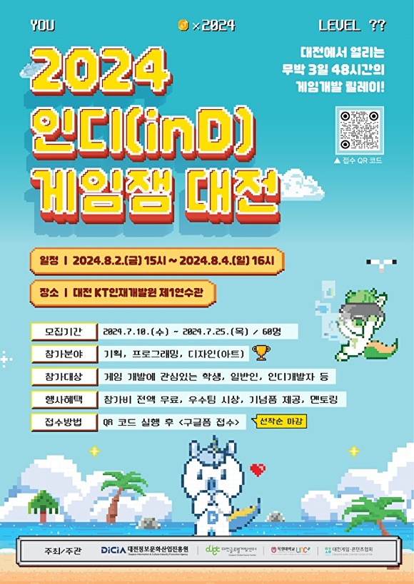 [아이뉴스24 박희석 기자] 대전정보문화산업진흥원은 대전글로벌게임센터의 게임개발 네트워킹 행사인 ‘2024 인디(inD) 게임잼 대전’의 참가자를 오는 25일까지 모집한다고 밝혔다.