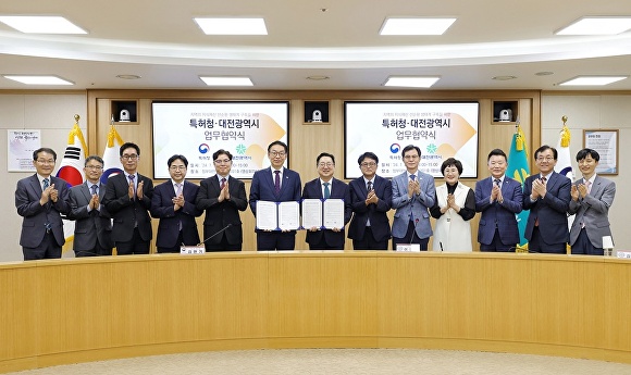 이장우 대전시장과 김완기 특허청장은 특허출원 세계 4위의 선진 지식재산기관인 특허청과 교육‧산업 전반에 걸친 포괄적 협력체계를 구축해 지식재산을 기반으로 대전 지역경제 성장을 촉진하기로 합의했다.