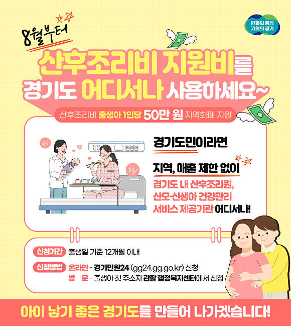 [아이뉴스24 김정수 기자] 그동안 사용지역을 제한하던 '산후조리 지원금'이 다음달부터는 경기도내 지역에 상관없이 사용할 수 있다.