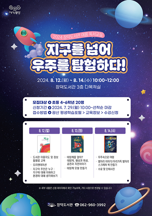 [아이뉴스24 한봉수 기자] 광주광역시 광산구 장덕도서관이 다음 달 12일부터 14일까지 초등학교 4~6학년을 대상으로 ‘지구를 넘어 우주의 세계를 탐험하다’의 주제로 여름 독서 교실을 운영한다고 30일 밝혔다.