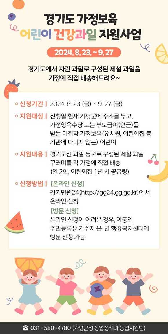 [아이뉴스24 이윤 기자] 경기도 가평군은 가정 양육 어린이를 대상으로 하는 ‘가정보육 어린이 건강과일 지원사업’ 신청 접수를 오는 23일부터 9월 27일까지 받는다.