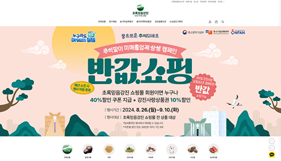 [아이뉴스24 김상진 기자] 전라남도 강진군이 운영하는 대표 농특산물 쇼핑몰 '초록믿음강진'이 추석명절을 맞아 최대 50% 할인 이벤트를 오는 26일부터 진행한다고 21일 밝혔다.