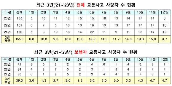 한편 충북경찰청이 밝힌 최근 3년간(2021~2023년) 도내 교통사고 사망자는 466명(연평균 155.3명)이다. 월 평균 12.9명이 교통사고로 숨진 셈이다.