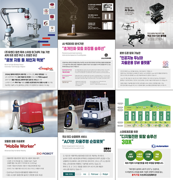 기술 전시는 모듈형 협동 이송로봇, AI 기반 자율주행 순찰로봇, 로봇 자동 툴체인져 등 6개사의 로봇 관련 최신 혁신 기술을 선보이며, 로봇 SW 플랫폼, 스마트제조 3DX 등 로봇과 접목 가능한 AI 및 빅데이터 기반 솔루션도 선보일 예정이다.