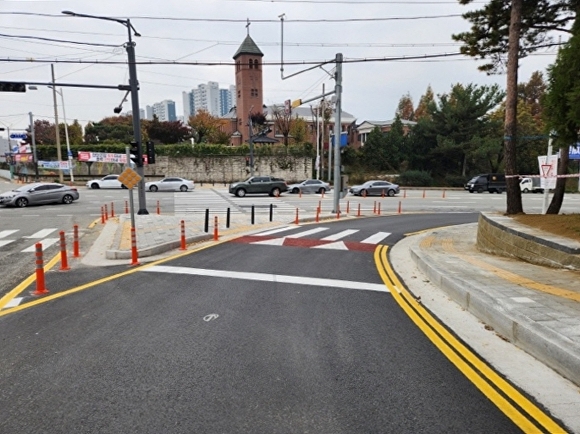 성모병원사거리에는 교통섬을 만들어 보행자 안전과 교통 편의를 확보했다.