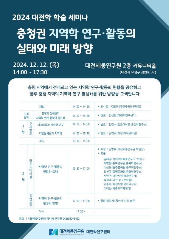 [아이뉴스24 박희석 기자] 대전세종연구원 대전학연구센터는 12일 오후 2시 대전세종연구원 2층 커뮤니티홀에서 2024 대전학 학술 세미나 ‘충청권 지역학 활성화 정책 포럼’을 개최한다고 밝혔다.
