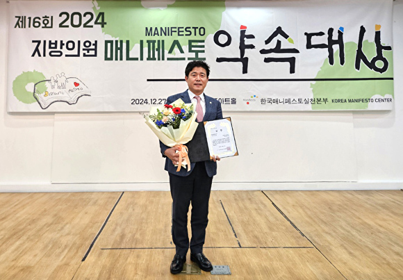 [아이뉴스24 이진우 기자] 경북 최영기 경주시의원이 27일 한국 매니페스토 실천본부가 주관하는 '제16대 지방의원 매니페스토 약속대상 좋은조례분야'에서 우수상을 수상했다.